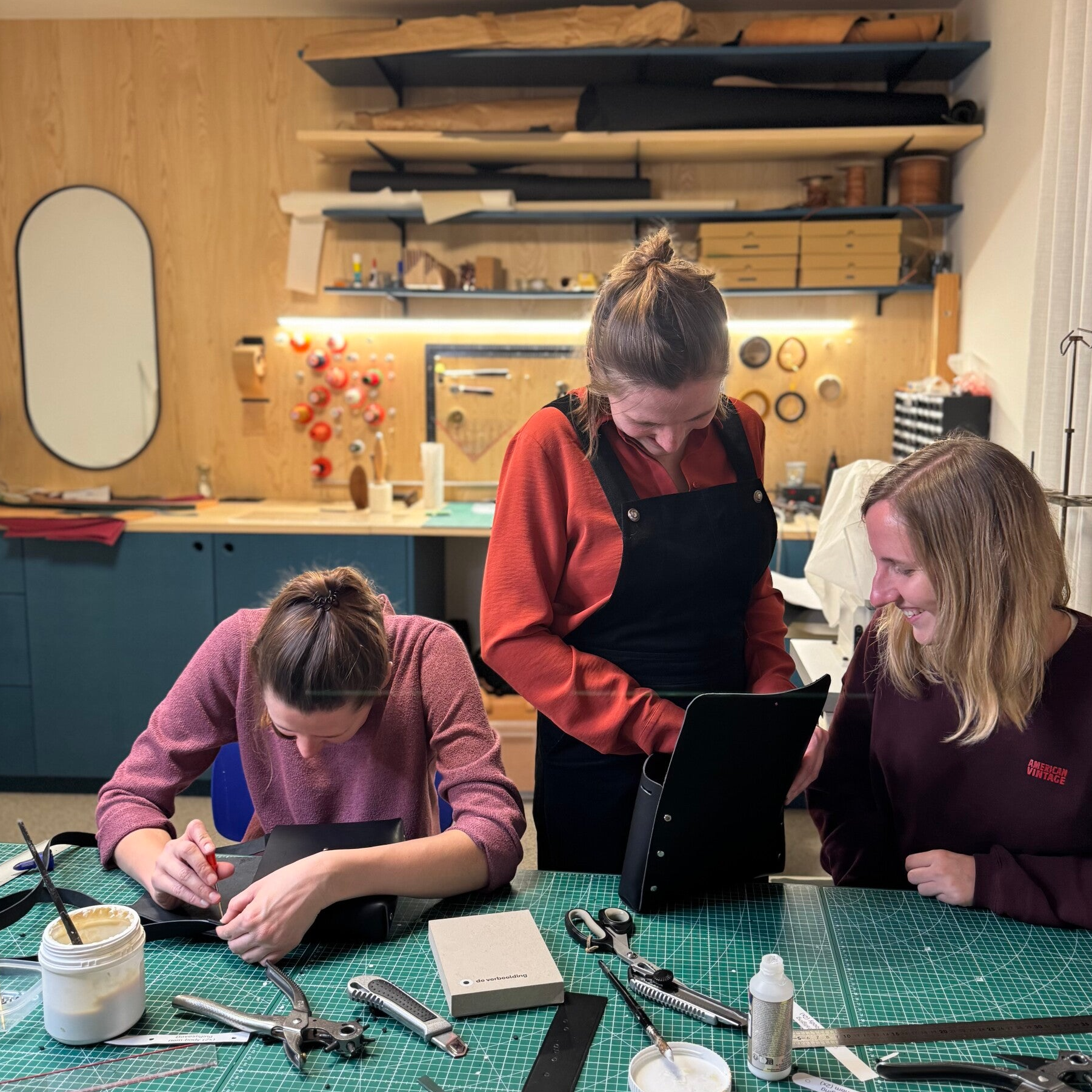 Onder begeleiding van Elien maak je in ongeveer drie uur je eigen unieke tas. Je leert de basis van leerbewerking — van patroonsnijden tot afwerken — met ruimte voor persoonlijke keuzes onderweg.